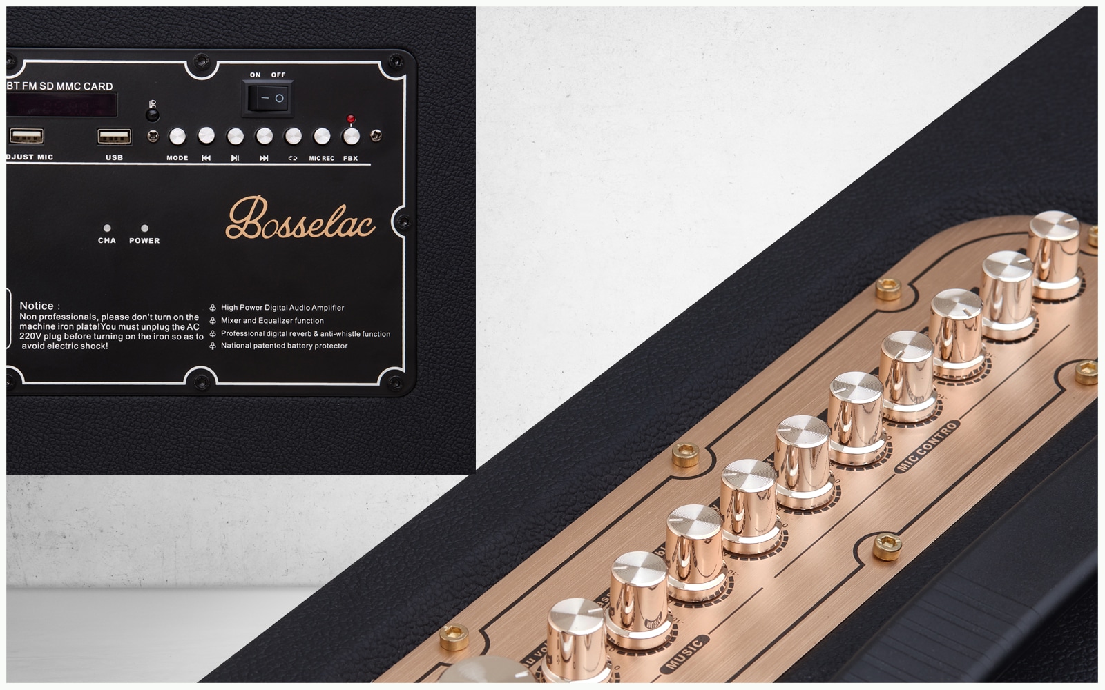 Tương tự như các dòng loa khác trên thị trường, các nút điều khiển của BossElac SK-668 cũng được tích hợp thành hàng gọn gàng ở mặt trên của sản phẩm để người dùng điều chỉnh âm lượng, tần số âm thanh, micro, các chế độ trình phát nhạc, chế độ giảm tiếng hú… Mặt sau của loa BossElac SK-668 là hệ thống nút nguồn, các ngõ vào và một vài thông tin về thông số sản phẩm. Ngoài ra còn được tích hợp một đèn báo sạc để thể hiện tình trạng điện năng của thiết bị (màu đỏ – đang sạc, màu xanh – sạc đầy)..