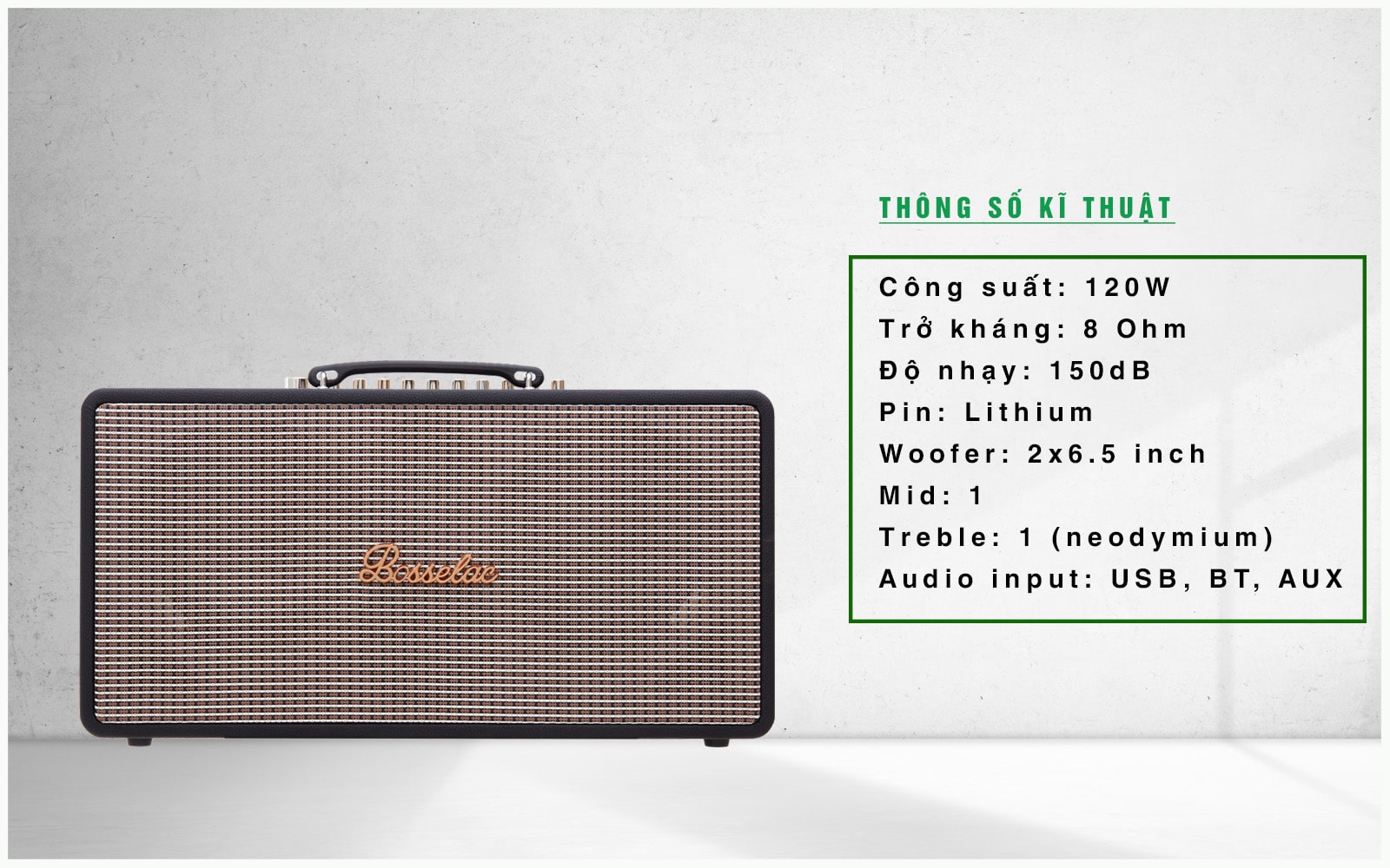 Loa BossElac HD-112 Loa BossElac SK-668 sở hữu hệ thống âm thanh 3 đường tiếng Bass – Mid – Treble với các củ loa gồm: 2 loa Bass 6.5 inch, 1 loa Mid và 1 loa Treble còi giúp tái tạo chất âm chuẩn sắc, chi tiết và chân thực. Công suất của loa BossElac Sk-668 là 120W và thiết bị có khả năng hoạt động liên tục từ 4 đến 7 giờ đồng hồ..