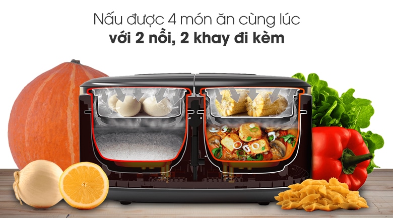 Người dùng có thể vừa nấu cơm, hấp rau, hấp trứng, hầm thịt nhờ có 2 nồi con và 2 xửng hấp kèm giúp tiết kiệm tối đa thời gian nấu nướng.